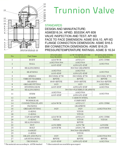 Product Details Cast Steel 3PC Trunnion Ball Valve Soft Seated Design and Manufactur API 6D, ASME B16.34, BS 5351, API 608, MSS SP-72 Face to Face Dimension ASME B16.10, API 6D, EN 558 Flange Connection Dimension ASME B16.5, ASME B16.47 (DIN 2501) BW Connection Dimension ASME B16.25 Pressure-Temperature Ratings ASME B16.34 Test and Inspection API 598, API 6D Type of Operation Manual, Gear, Electric, Pneumatic, Manual-Air-Hydraulic NPS 16"~56" Class 150lb~1500lb Main Material WCB, WCC, LCB, LCC, CF8, CF8M, CF3, CF3M, CF8C, CN7M Anti-Static Design Fire Safe Design to per API 607/6FA - Top-Entry Trunnion Ball Valve